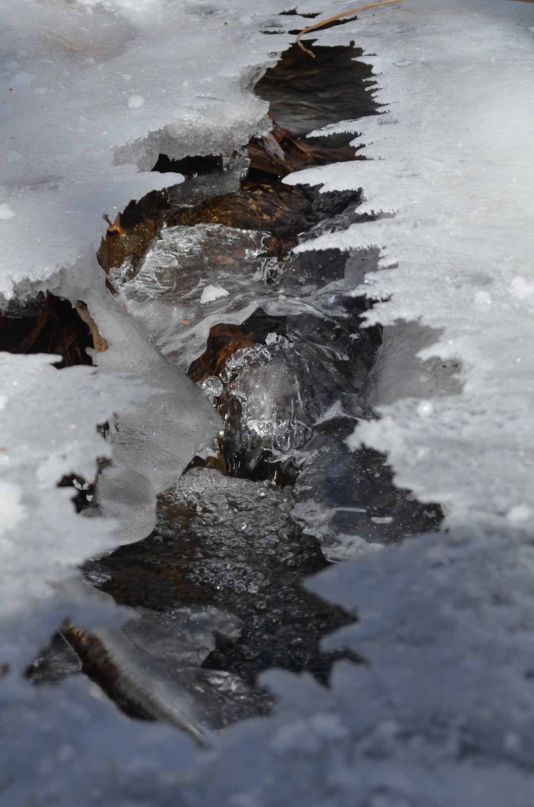 Almost frozen the creek's black line slithers through the snow and the forest, meandering under, over, in between... disappearing under tunnels of snow.
